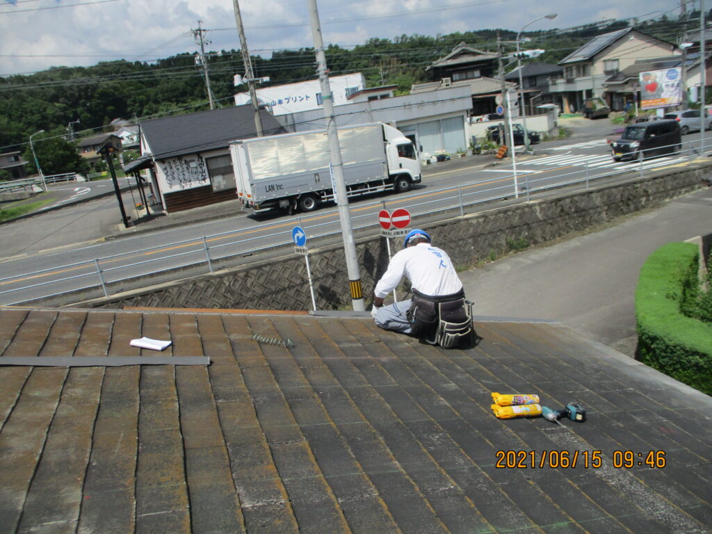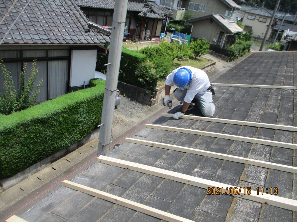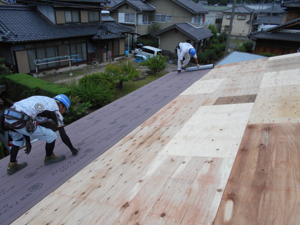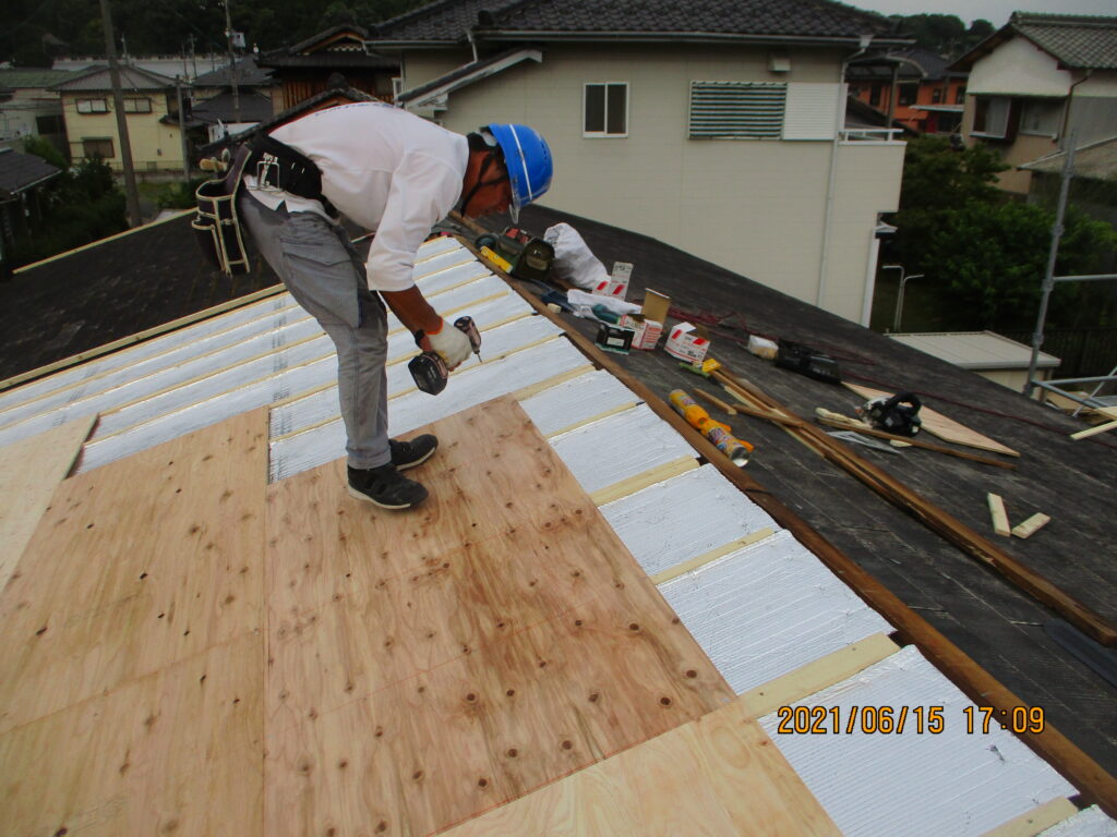 工場や屋根が大きいお宅では、作業範囲を分けて施工するため、木下地からここまでの作業を繰り返し行います。
