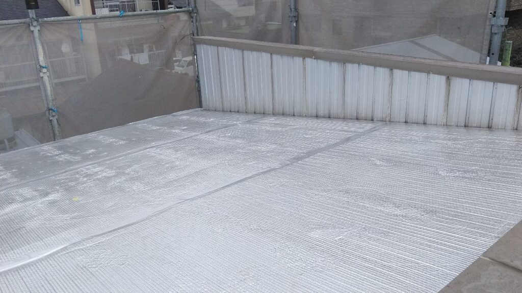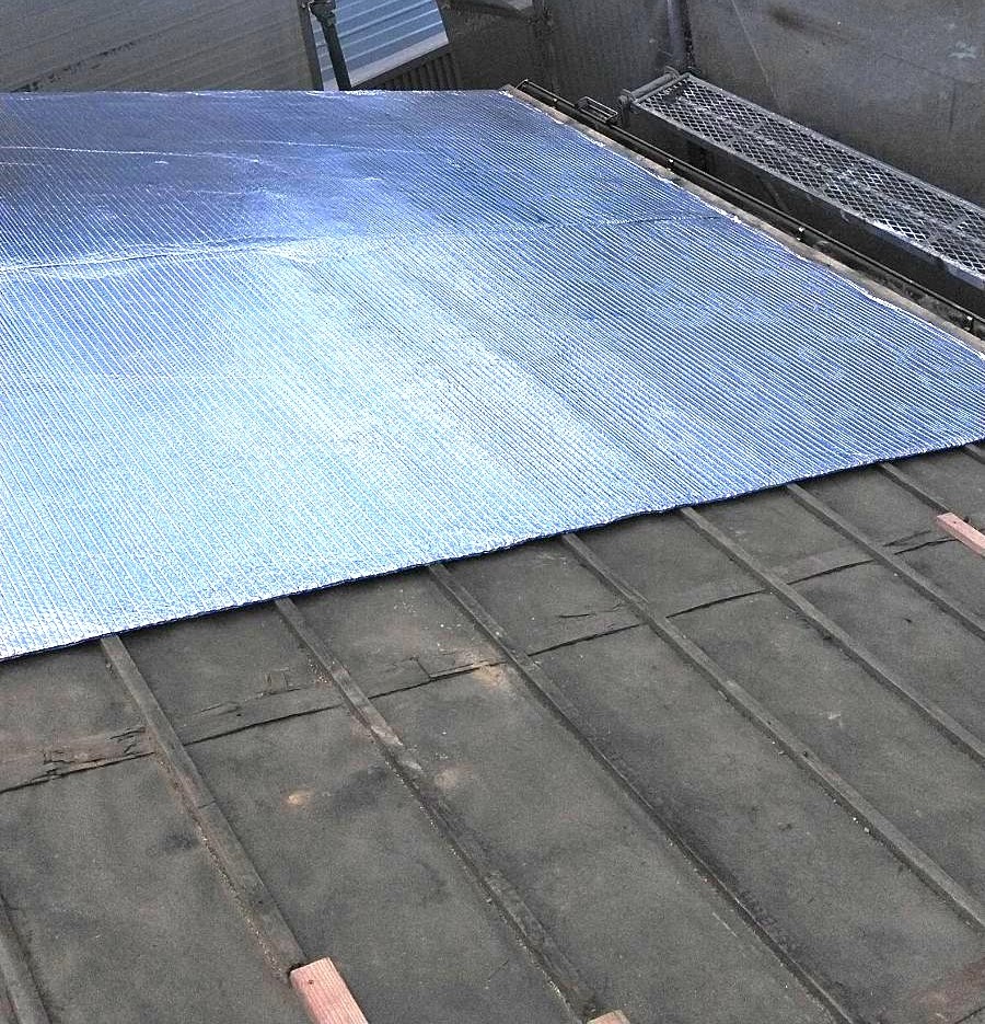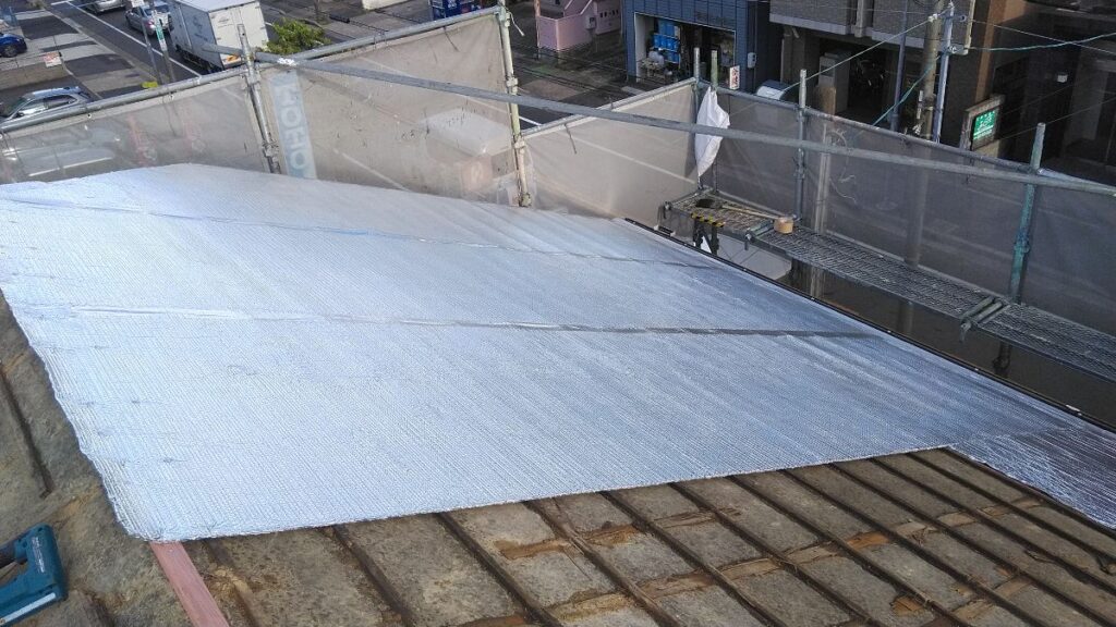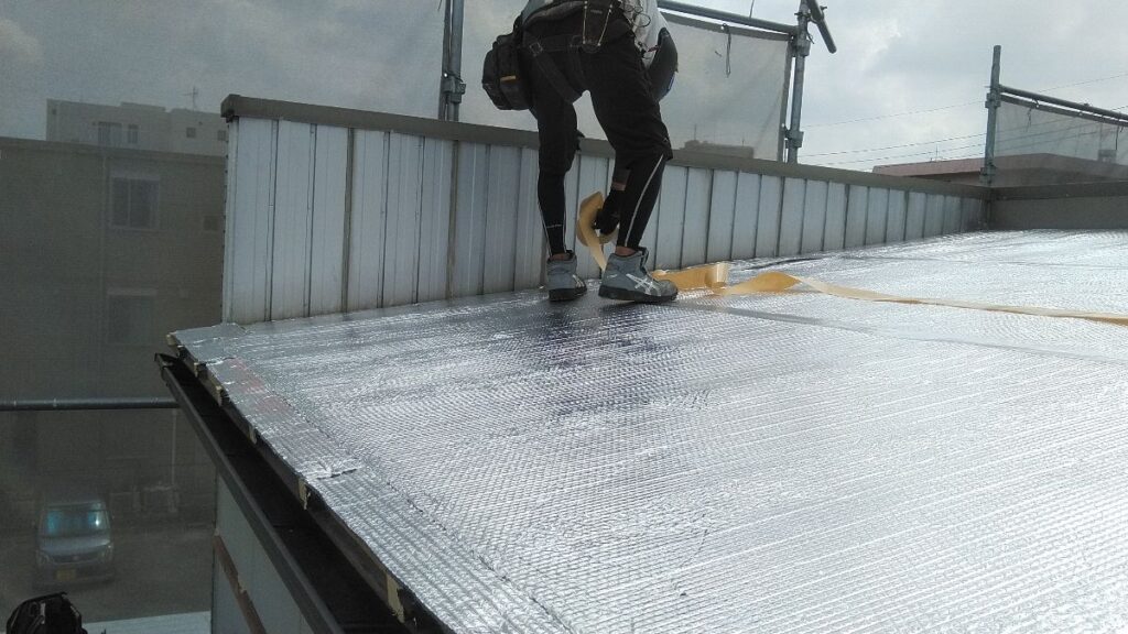 木下地の上から遮熱シート“リフレクティックス”を全面に張ります。シートのつなぎ目は専用の絶縁テープで留めます。