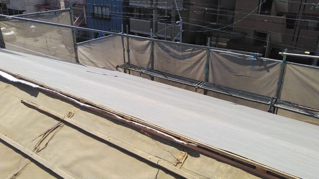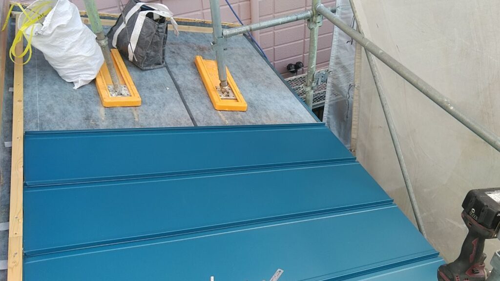 既存屋根材の上から新規屋根材を葺くカバー工法で施工していきます。
