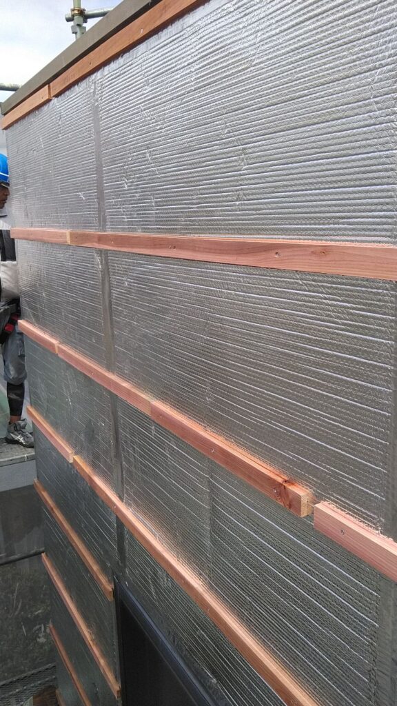 外壁に木下地を一定間隔で取付け(横桟)、上からリフレクティックスを張ります。