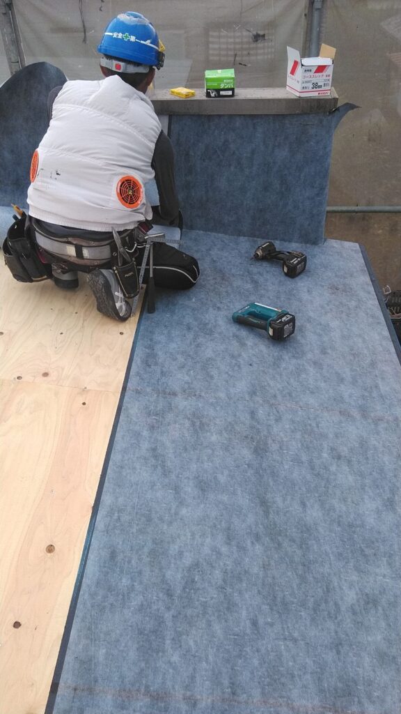 野地板の上からルーフィング(防水機能性シート)を張ります。屋根の立上り部にも張ります。