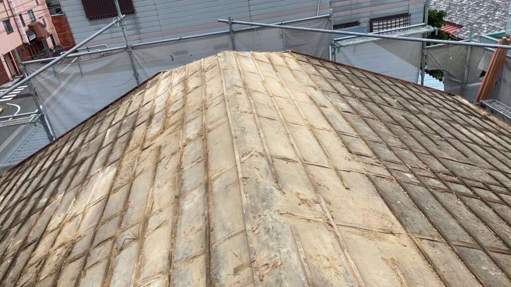 本宅屋根工事にはいります。既存の屋根材(瓦)を撤去します。撤去した瓦は産業廃棄物として処理します。