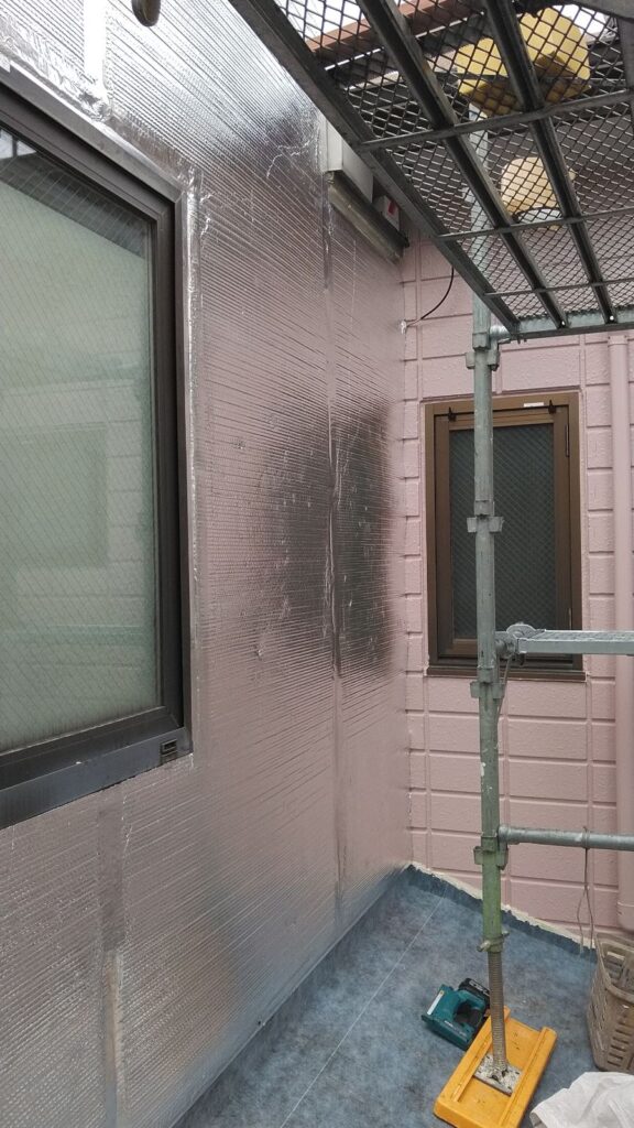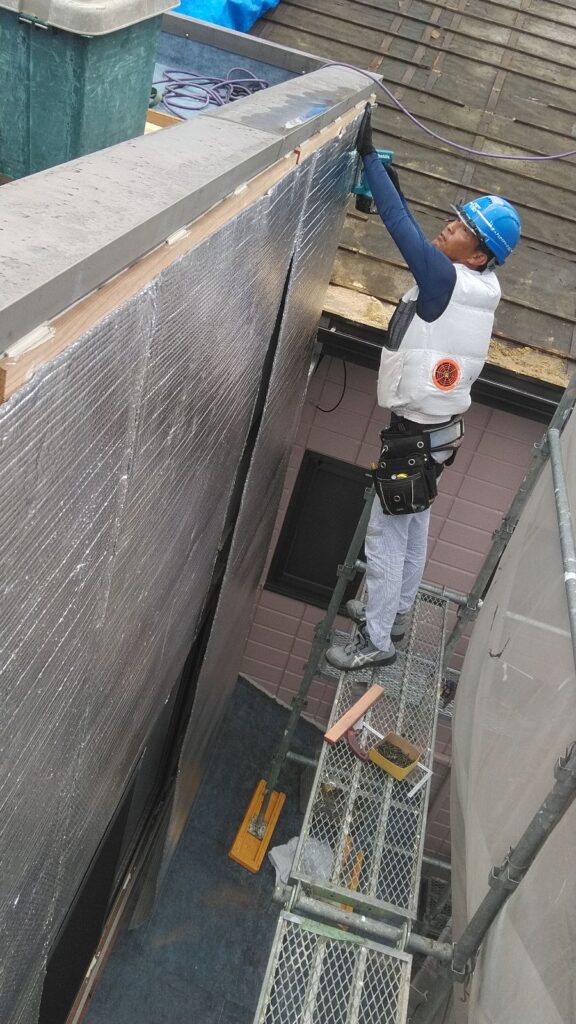 南面の作業に入ります。木下地を取付けリフレクティックスを張ります。