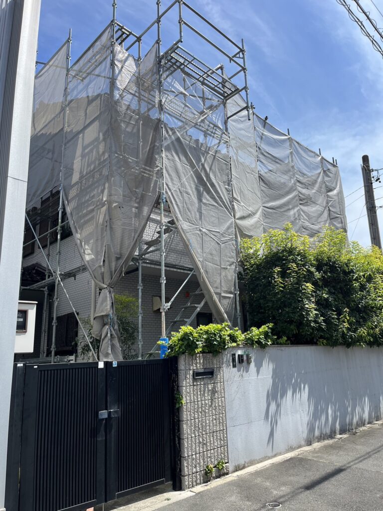 屋根全面改修・遮熱工事の現場です。作業用の外部足場を架け、飛散・落下防止のメッシュシートを張ります。