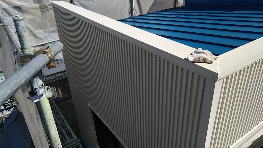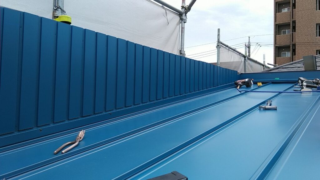 ルーフィングの上から新設屋根材を立平葺きし、水切りなどの役物を取付けます。パラペットには角波を張ります。