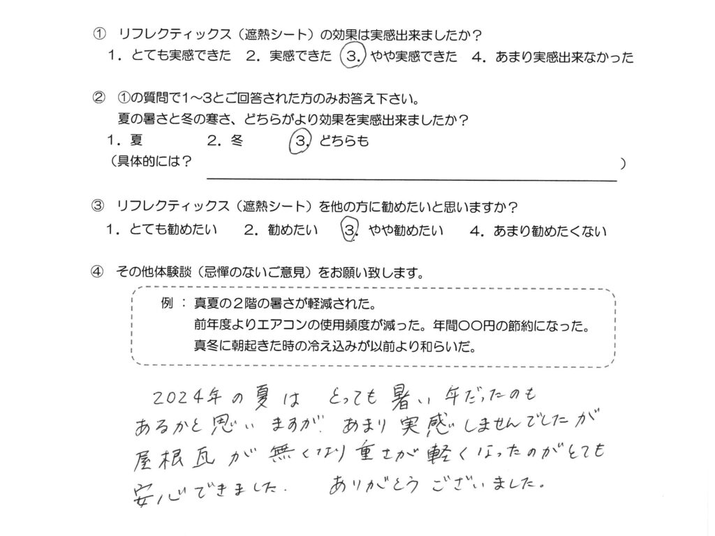 →2024年の夏はとっても暑い年だったのもあるかと思いますが、あまり実感しませんでしたが屋根瓦が無くなり重さが軽くなったのがとても安心できました。