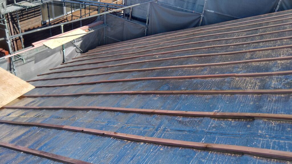 着工です。外部足場を架け、既設屋根材を撤去し下地不足箇所に新設胴縁を取付けます。
