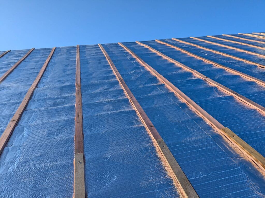 リフレクティックスを張り、シートのつなぎ目は専用の絶縁テープを貼ります。 リフレクティックスはエアコンなどの電気代が大幅にカットできます。今回は夏場だと割と涼しい海の近くの現場ですが、冬場の寒さやその他の季節でも1年を通して快適な室温になります。