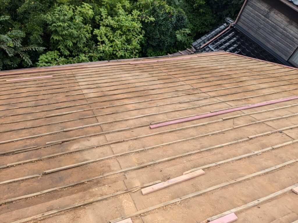 着工です。既設の屋根を撤去し、胴縁の不足部分に新設胴縁を取付けます。