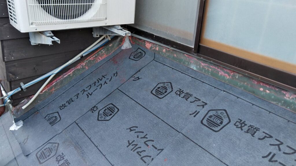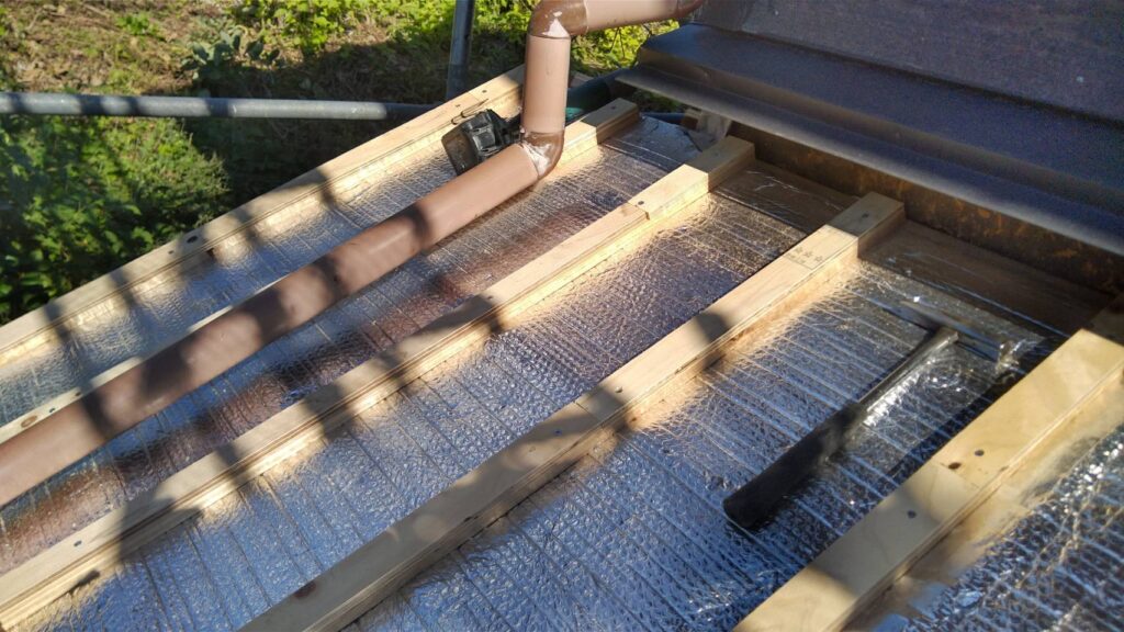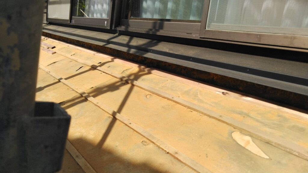 下屋の既設屋根材を撤去し、土などをきれいに掃き、下地の不足箇所に胴縁を取付けます。
