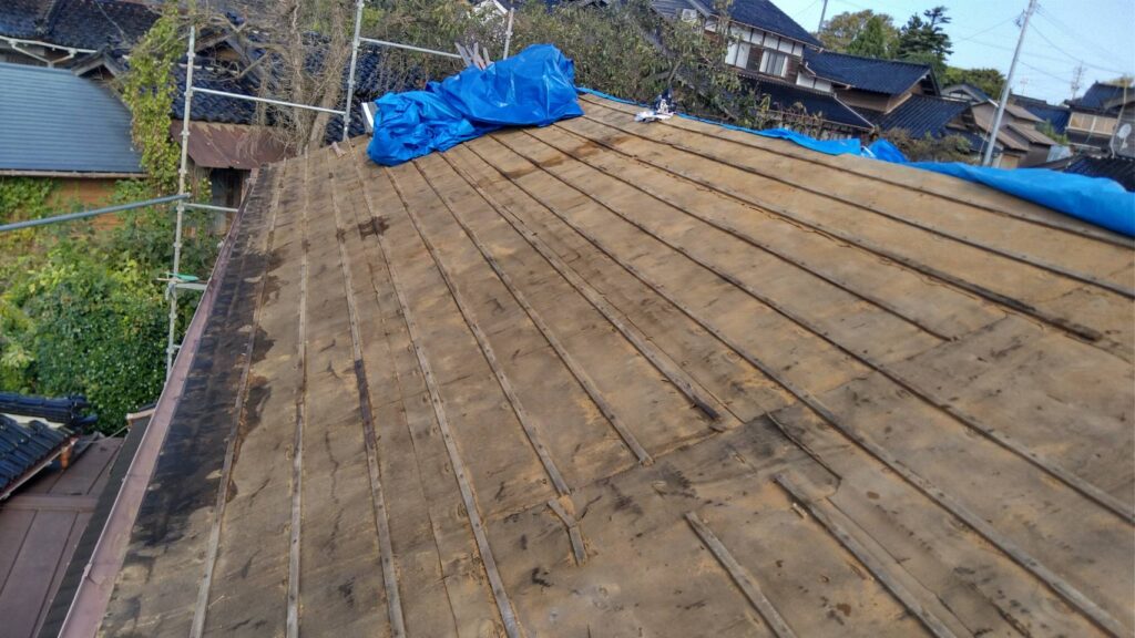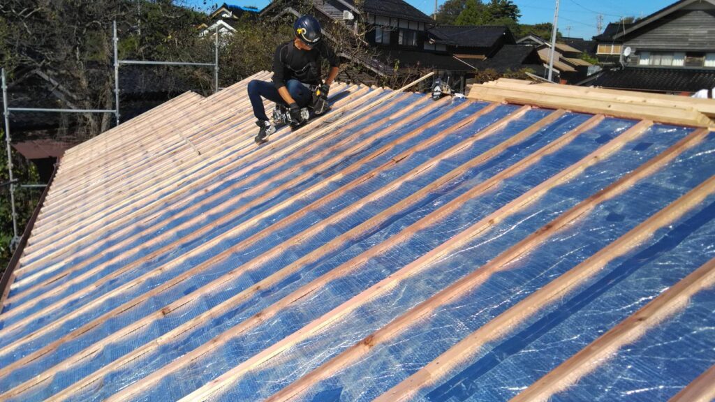 大屋根の既設屋根材を撤去し、土などをきれいに掃き、下地の不足箇所に胴縁を取付けます。