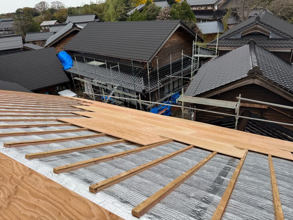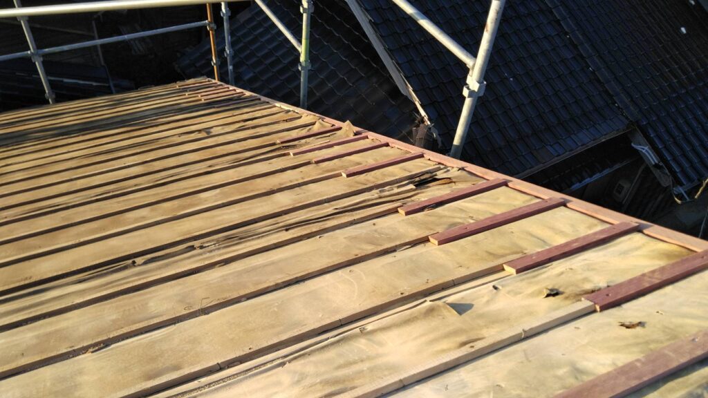 着工です。既設の屋根を撤去し、胴縁の不足部分に新設胴縁を取付けます。