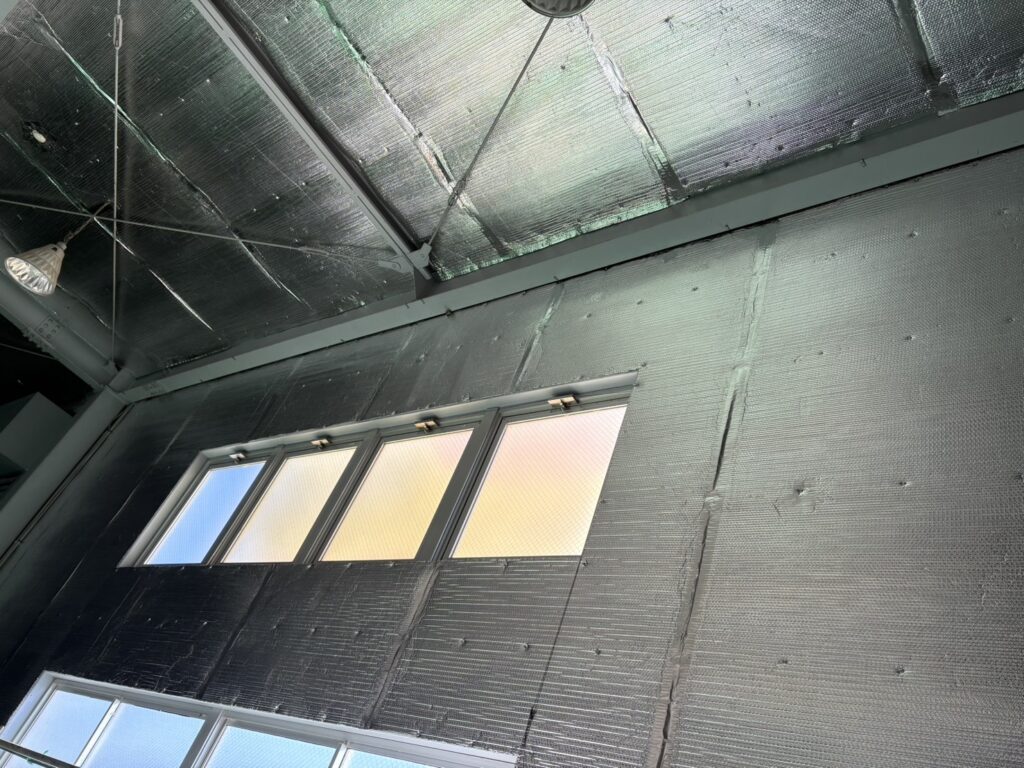 以前、別箇所の壁にリフレクティックスを施工し遮熱効果を体感していただきました。今回は天井にも施工するので、より効果を感じて快適に作業していただけるかと思います。